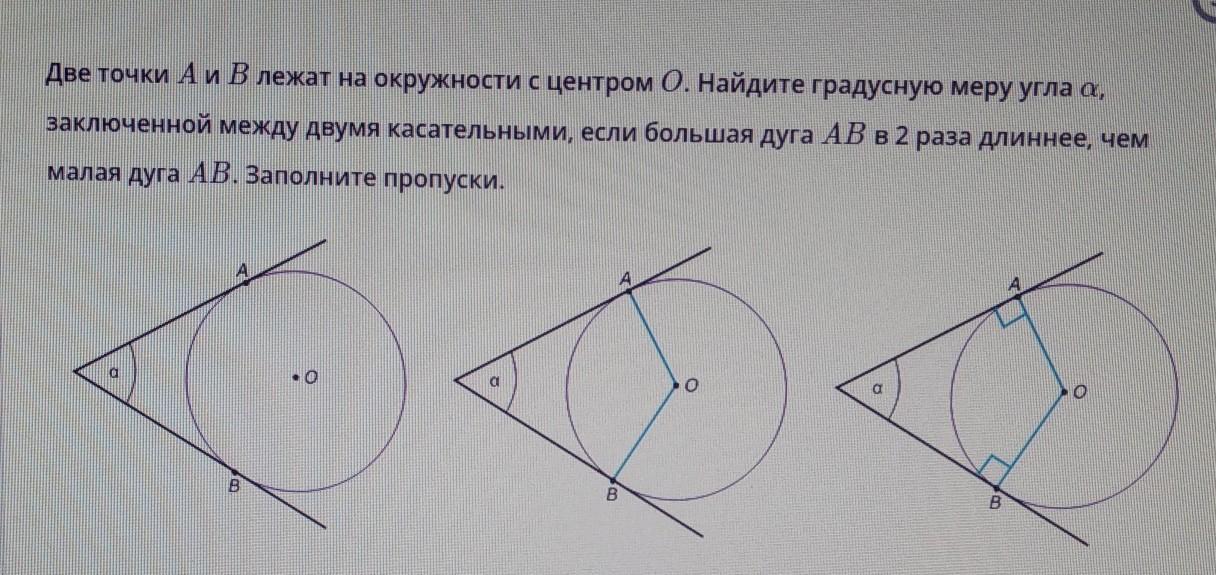 две точки а и в лежат на окружности с центром о найдите градусную меру угла а заключенной между двумя касательными,если большая дуга ав в 2 раза длиннее,чем малая дуга ав