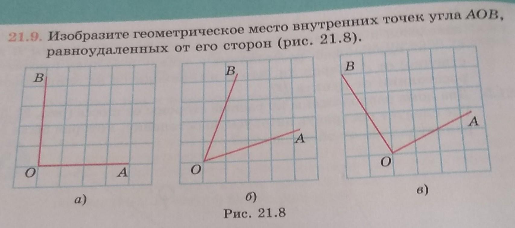 Изобразите геометрическое место внутренних точек угла АОВ, равноудалёных от его сторон (рис. 21.8).