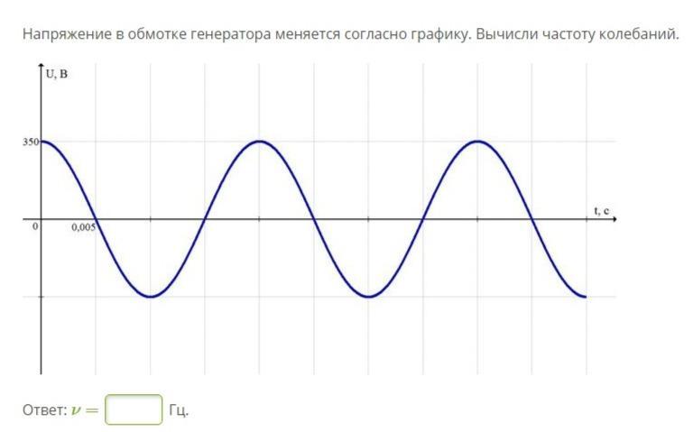 Напряжение в обмотке генератора меняется согласно графику. Вычисли частоту колебаний. пожалуйста.