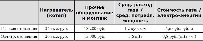 Хозяин участка планирует устроить в жилом доме зимнее отопление. Он рассматривает два варианта: электрическое или газовое отопление. Цены на оборудование и стоимость его установки, данные о расходе газа, электроэнергии и их стоимости даны в таблице.