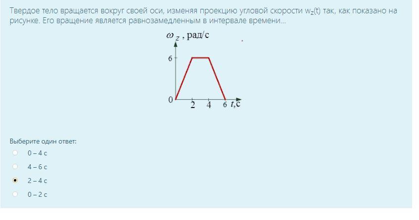 Твердое тело вращается вокруг своей оси, изменяя проекцию угловой скорости wz(t) так, как показано на рисунке. Его вращение является равнозамедленным в интервале времени…