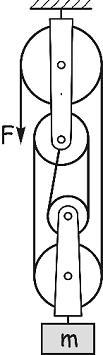 Срочно!!!!! Какую минимальную вертикальную силу F нужно прикладывать к свободному концу нити, чтобы поднимать груз массой m=10 кг (см. рис.)? Все участки нити между блоками считайте вертикальными. Ответ приведите в ньютонах, округлив до целого числа. Ускорение свободного падения g=10 Н/кг.