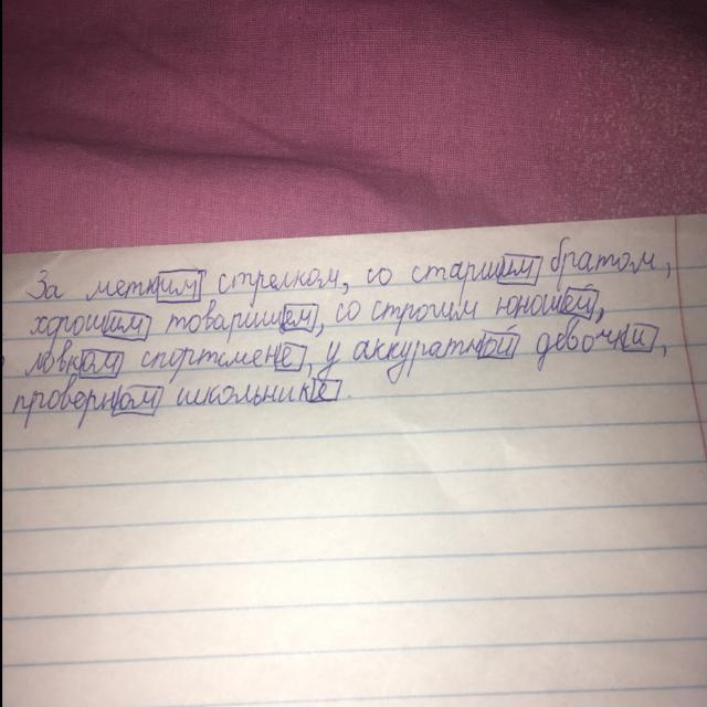 За метк..м стрелком, со старш..м братом, с хорош..м товарищ..м, со строгим юнош..й, о ловк..м спортсмен…, у аккуратн..й девочк…, о проворн…м школьник….