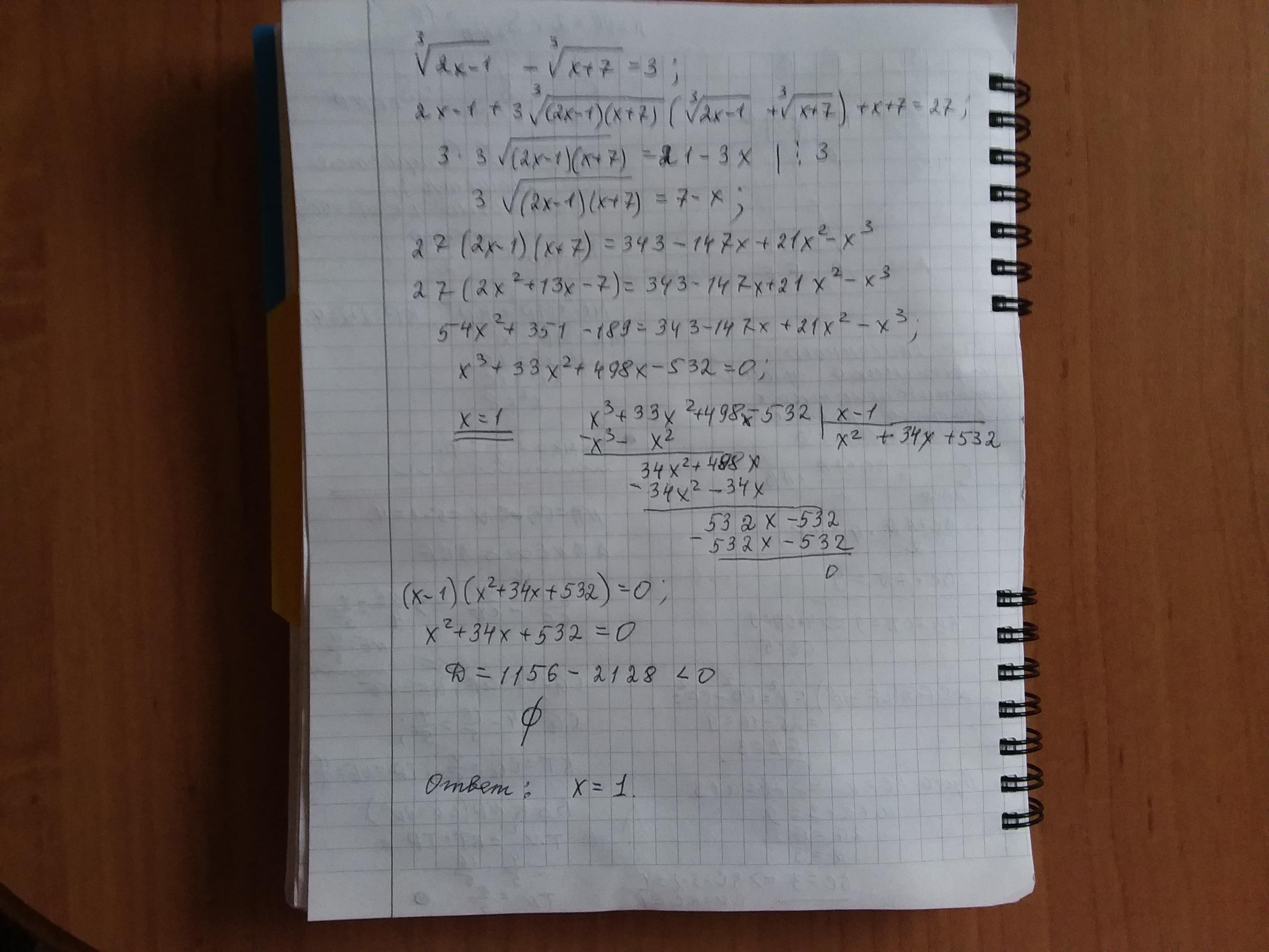 (x - 1)(x² +34x +532) = 0 ; x = 1