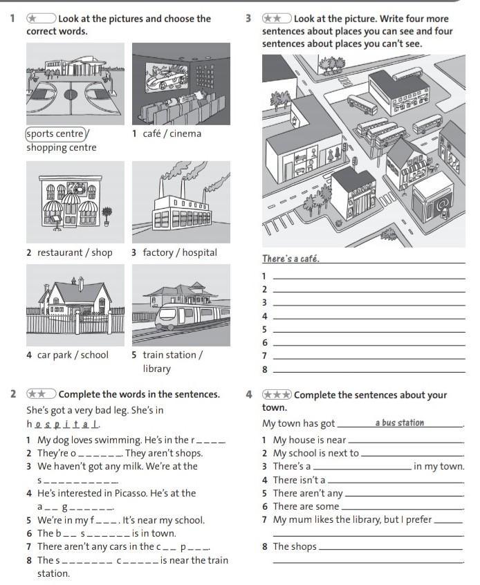 Ответ: 1-я картинка sports centre; 2-я cinema; 3-я restaurant; 4-я factory; 5-я school; 6-я traine station.