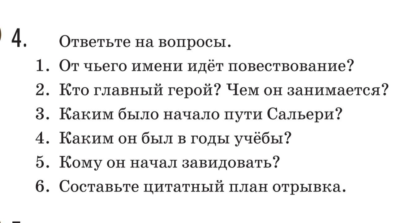 От чьего имени идет повествование.Кто главный герой? Чем он занимается? Каким было начало пути Сельери? Каким он был в годы учебы?.Кому он начал завидовать? Составте цитатный план отрывка.