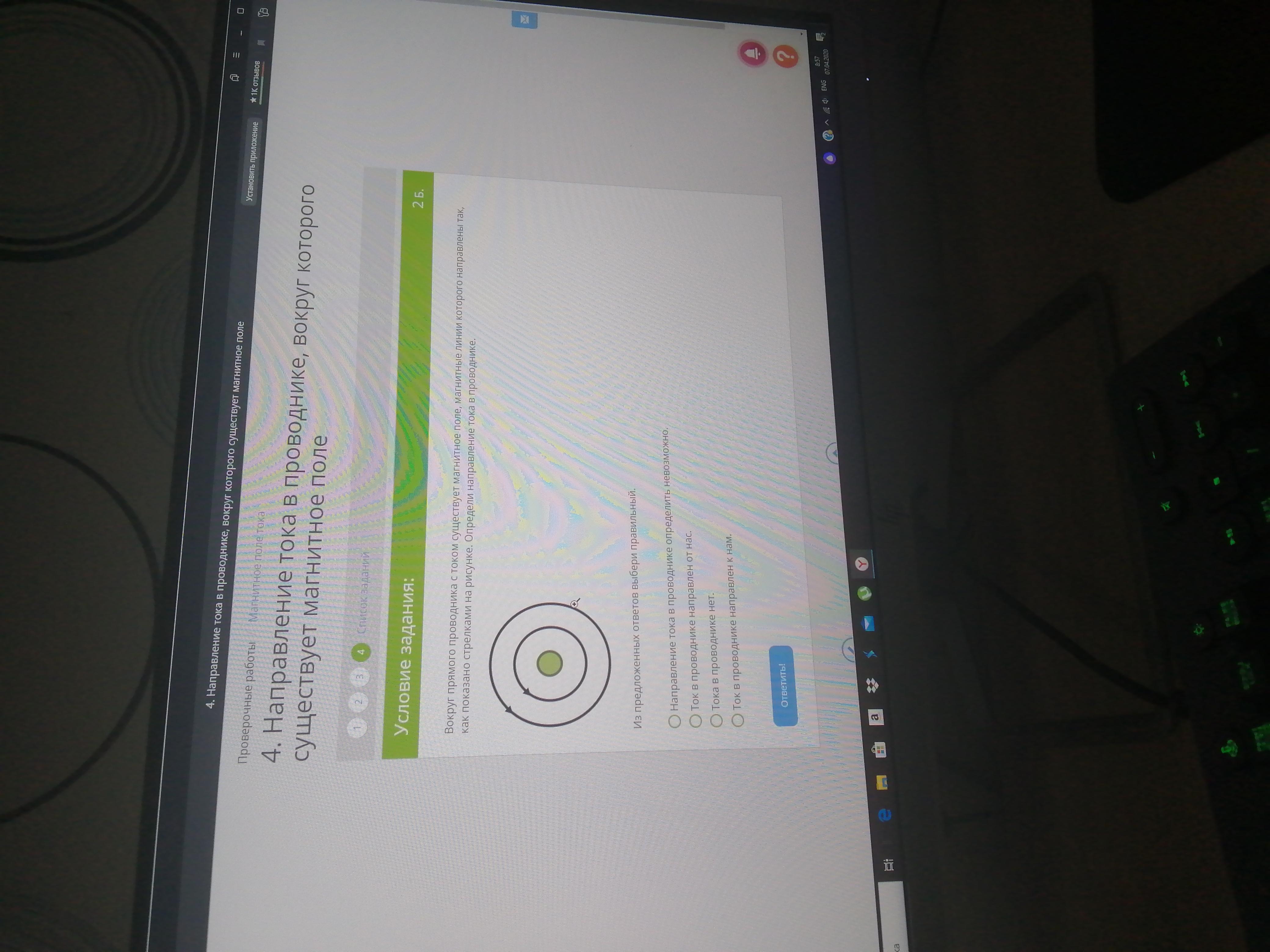 Вокруг прямого проводника с током существует магнитное поле, магнитные линии которого направлены так как показано стрелками на рисунке. Определите направление тока в проводнике