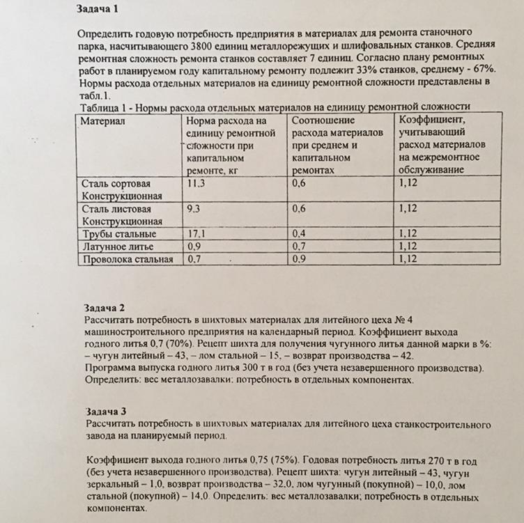 Определить годовую потребность предприятия в материалах для ремонта станочного парка, насчитывающего 3800 единиц металлорежущих и шлифовальных станков. Средняя ремонтная сложность ремонта станков составляет 7 единиц. Согласно плану ремонтных работ в планируемом году капитальному ремонту подлежит 33% станков, среднему - 67%. Нормы расхода отдельных материалов на единицу ремонтной сложности представлены в табл.1. Задание 2