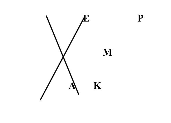 На рисунке изображены две прямые ЕК и АР, пересекающиеся в точке М.