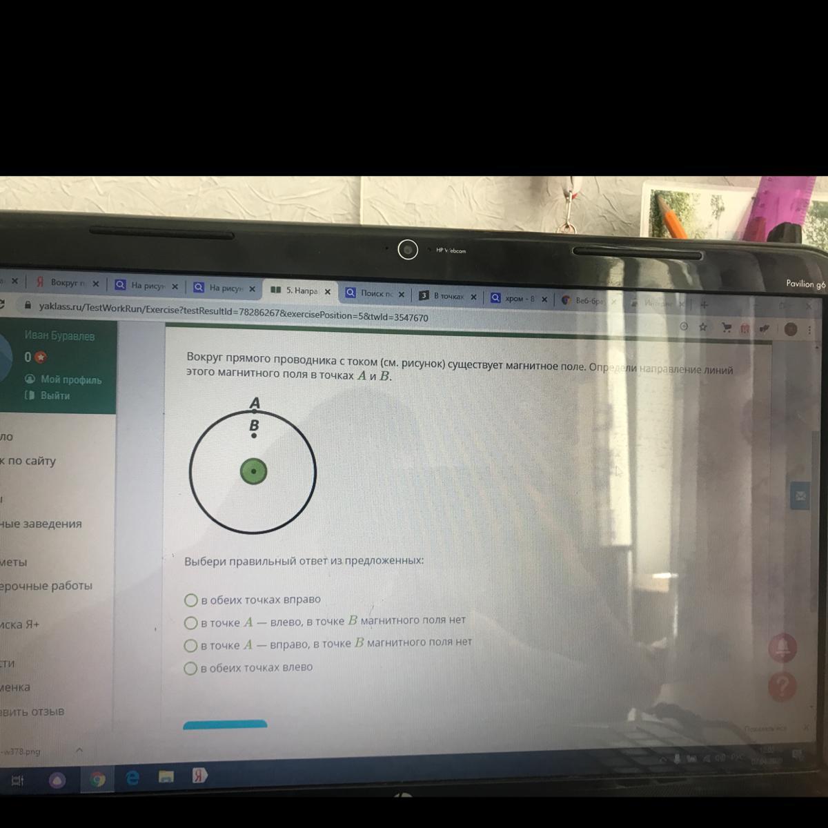 Вокруг прямого проводника с током (см. рисунок) существует магнитное поле. Определи направление линий