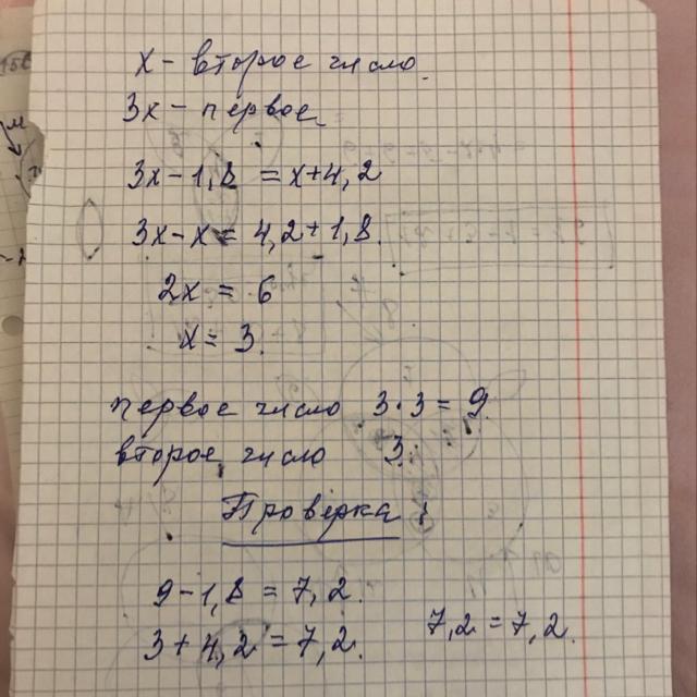 Первое число в 3 раза больше второго. Если от первого числа отнять 1,8, а ко второму прибавить 4,2, то получатся одинаковые результаты. Найдите первое число.