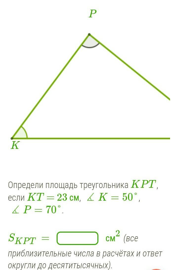 Определи площадь треугольника KPT, если KT = 23 см, ∡K=50°, ∡P=70°.