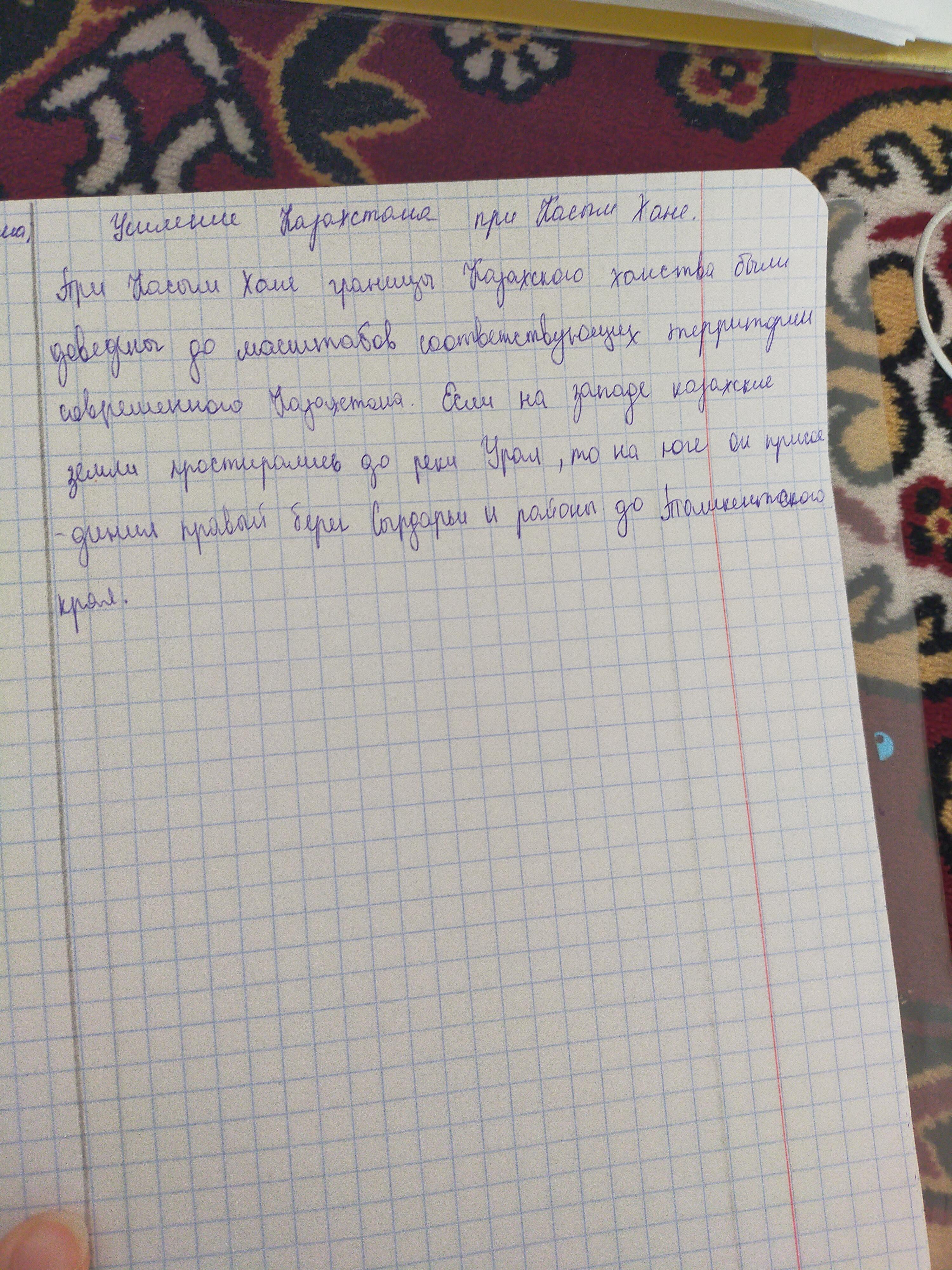При Касым хане границы Казахского ханства были доведены до масштабов, соответствующих территории 1 ______________________________. Если на западе казахские земли простирались до 2 ______________________, то на юге он присоединил 3 _____________________________ и 4 _________________________________.