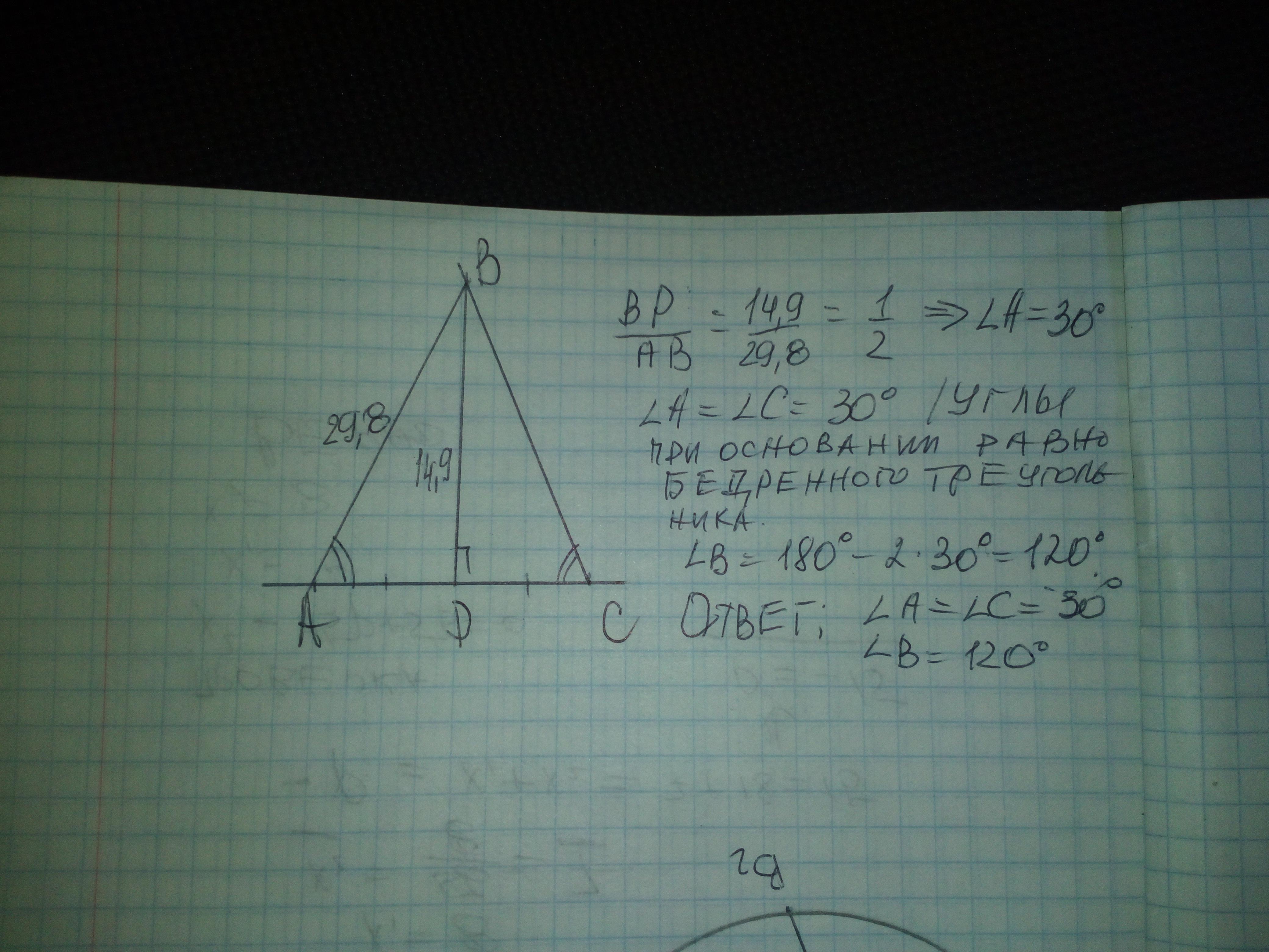В данных треугольниках боковая высота является гипотенузой. Она в 2 раза больше высоты, а катет, лежащий против угла 30° равен половине гипотенузы⇒∠С=∠А=30°(т.к. треугольник равнобедренный.