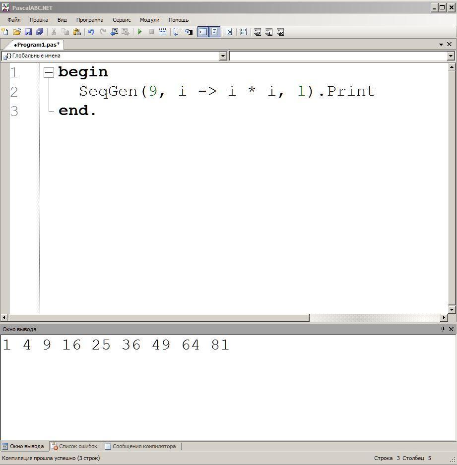 SeqGen(9, i -> i * i, 1).Print