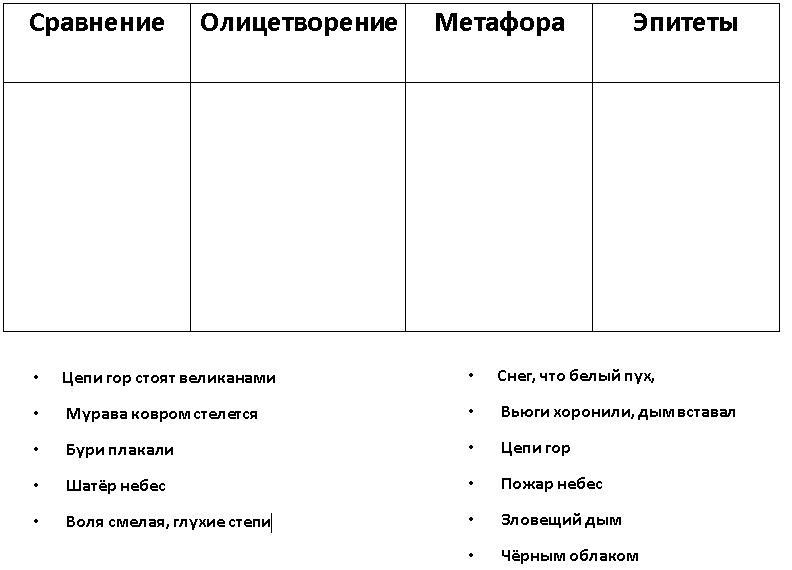 "Распределите в столбцы таблицы примеры средств выразительности."