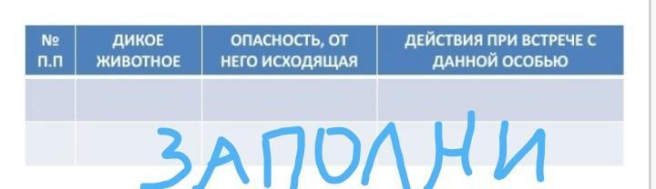 С ПОМОЩЬЮ СПРАВОЧНОЙ ЛИТЕРАТУРЫ ОПРЕДЕЛИТЕ ОСНОВНЫЕ ВИДЫ ДИКИХ ЖИВОТНЫХ, ОБИТАЮЩИХ В ЛЕСАХ ВЛАДИМИРСКОЙ ОБЛАСТИ. ОХАРАКТЕРИЗУЙТЕ ОПАСНОСТЬ, КОТОРУЮ ОНИ МОГУТ ПРЕДСТАВЛЯТЬ ДЛЯ ЧЕЛОВЕКА ПРИ ВСТРЕЧЕ С НИМИ В ПРИРОДНЫХ УСЛОВИЯХ, И ВАШИ ДЕЙСТВИЯ, ЕСЛИ С ДИКИМ ЖИВОТНЫМ ВСТРЕТИЛИСЬ ВЫ. ОФОРМИТЕ ВАШИ ИЗЫСКАНИЯ В ТАБЛИЧНОЙ ФОРМЕ.