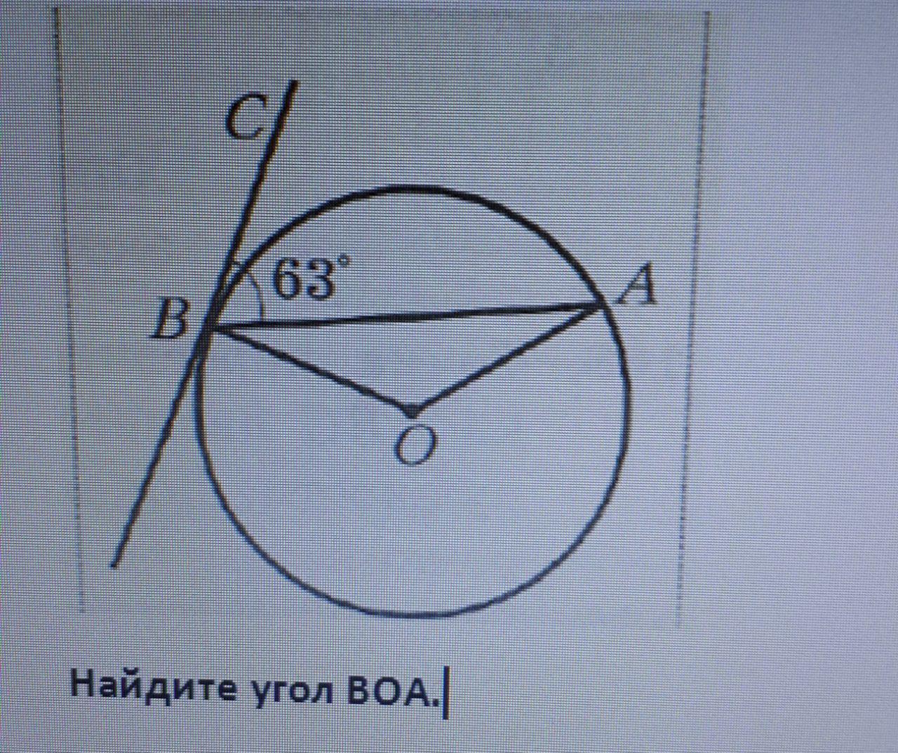 BC - касательная к окружности. Радиус, проведенный в точку касания, перпендикулярен касательной, т.е. ∠OBC = 90° ⇒ ∠OBA = 90° - ∠ABC = 27°.