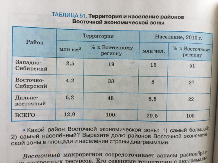Выразите долю районов Восточной экономической зоны в площади и населении страны диаграммами.
