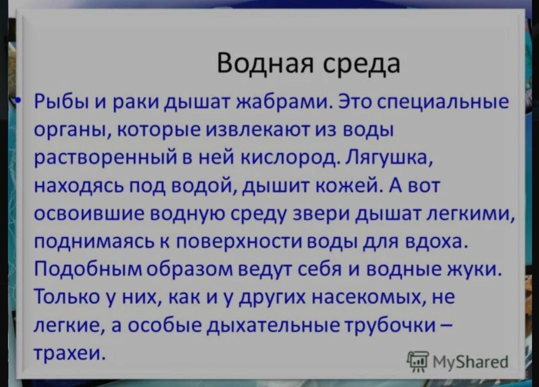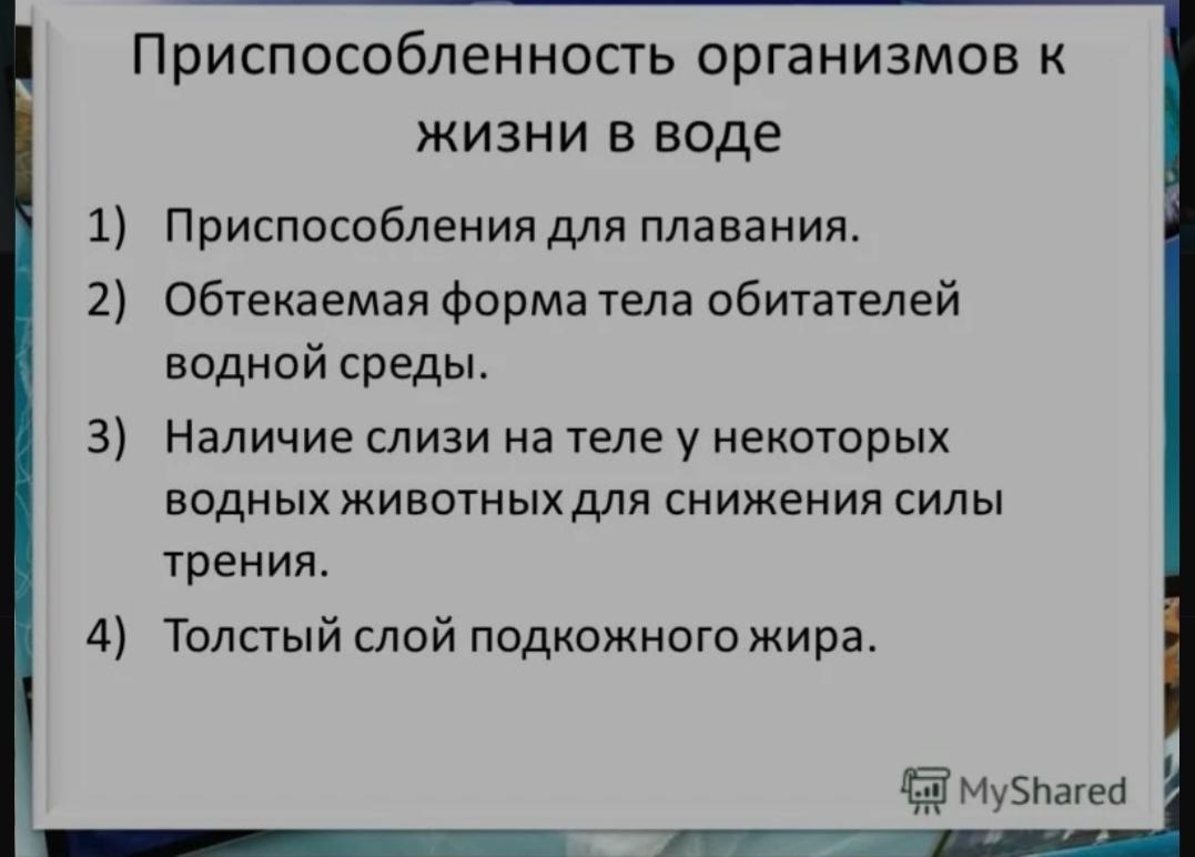 Важнейшее условие жизни в океане — это растворенный в воде кислород, которым дышат морские обитатели. Водный источник кислорода — водоросли, в которых осуществляется фотосинтез, поэтому на поверхности кислорода больше, чем на глубине. У морских обитателей есть плавники, жабры, скликая чешуя, плавательный пузырь, именно это является приспособлениями морских обитателей к жизни в воде