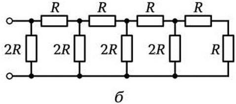 Чему равно эквивалентное сопротивление цепи, схема которой изображена на рис. б, если R = 50 Ом?