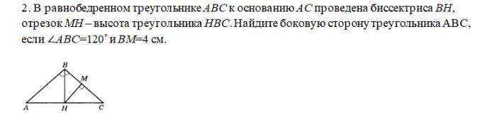 В равнобедренном треугольнике ABC к основанию AC проведена биссектриса BH, отрезок MH – высота треугольника HBC. Найдите боковую сторону треугольника ABC, если ∠ABC=120˚ и BM=4 см