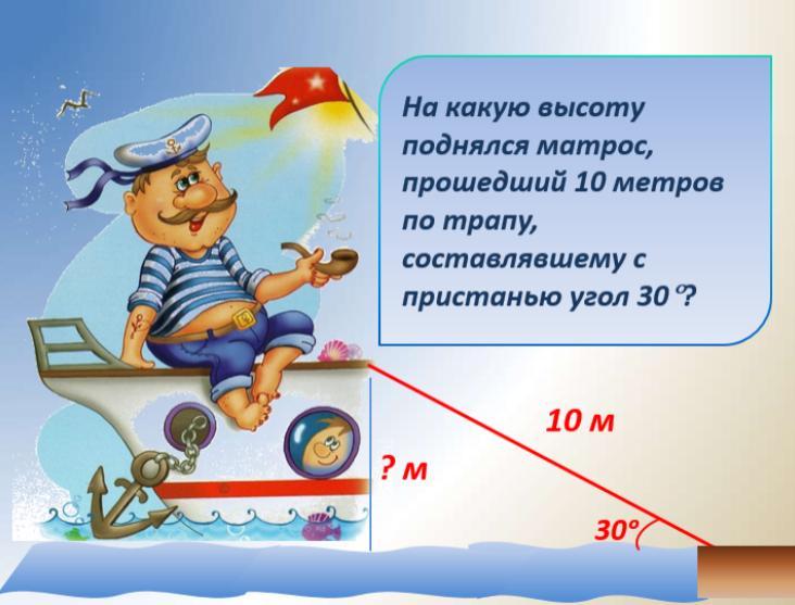 На какую высоту поднялся матрос, прошедший 10 метров по трапу, составлявшему с пристанью угол 30 ?