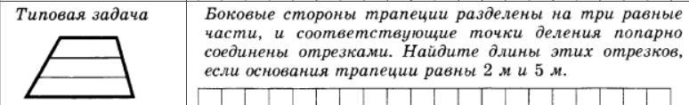 Боковые стороны трапеции разделены на три равные части, и соответствующие точки деления попарно соединены отрезками. Найдите длины этих отрезков, если основания трапеции равны 2м и 5м.