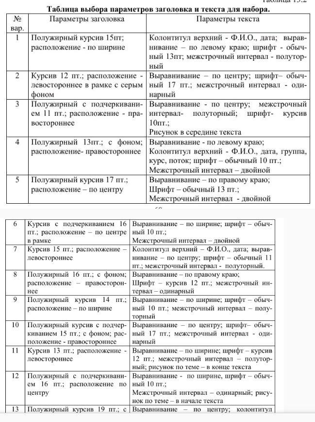 Разделите текст на 15 абзацев и отформатируйте каждый абзац как указано в таблице (первый столбик в таблице это номер абзаца)