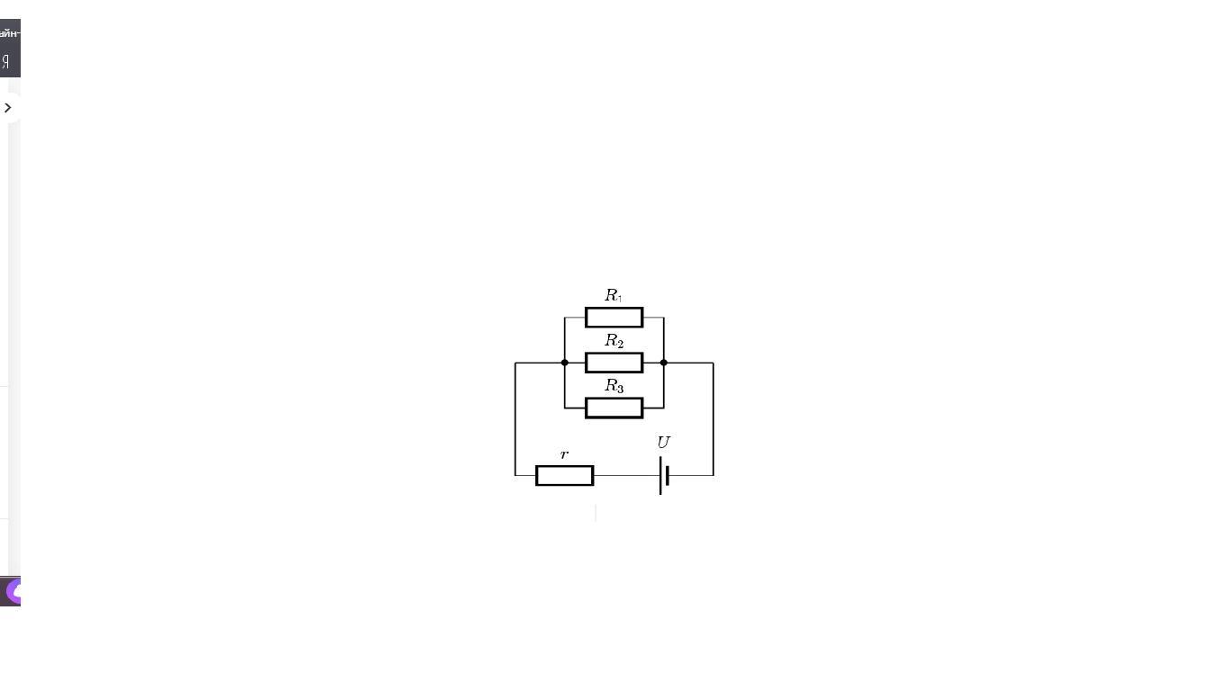 Источник с напряжением В U=6 В, последовательно подключен к резистору с r=1 Ом, и к ним подключены три параллельных резистора R1=1 Ом, R2=2 Ом, R3=2 Ом. Какой силы ток течет через источник? Ответ выразить в A, округлить до целых