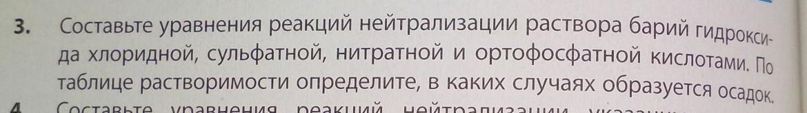 Чоставьте уравнения реакций нейтрализации раствора барий гидроксида хлоридной, сульфатной, нитратной и ортофосфорной кислотами. По таблице растворимости определите, в каких случаях образуется осадок