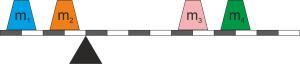Дан невесомый рычаг с двумя противовесами на каждой стороне. Массы противовесов m1=5 кг, m2=131 кг и m3=11 кг. Какова масса противовеса m4, если рычаг находится в равновесии?