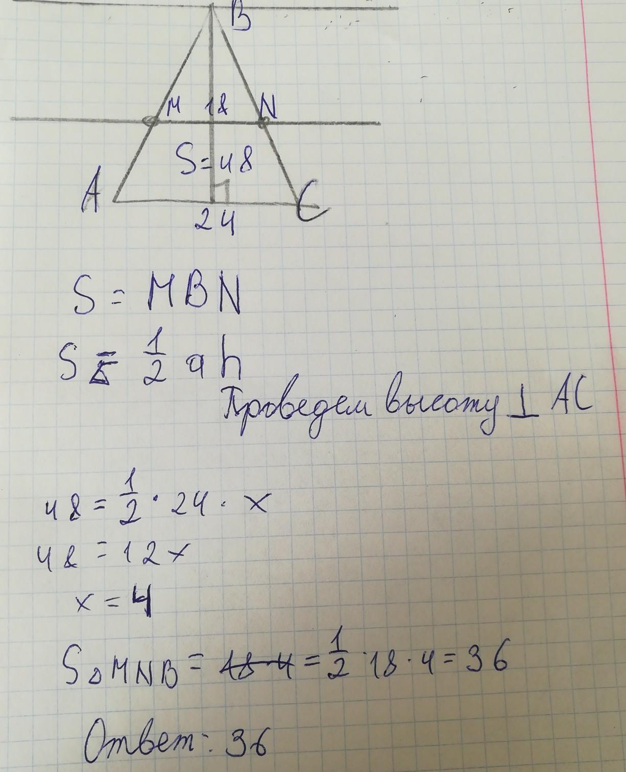 3. Прямая, параллельная стороне AC треугольника ABC, пересекает стороны AB и BC в точках M и N соответственно, AC=24, MN=18. Площадь треугольника ABC равна 48. Найдите площадь треугольника MBN.