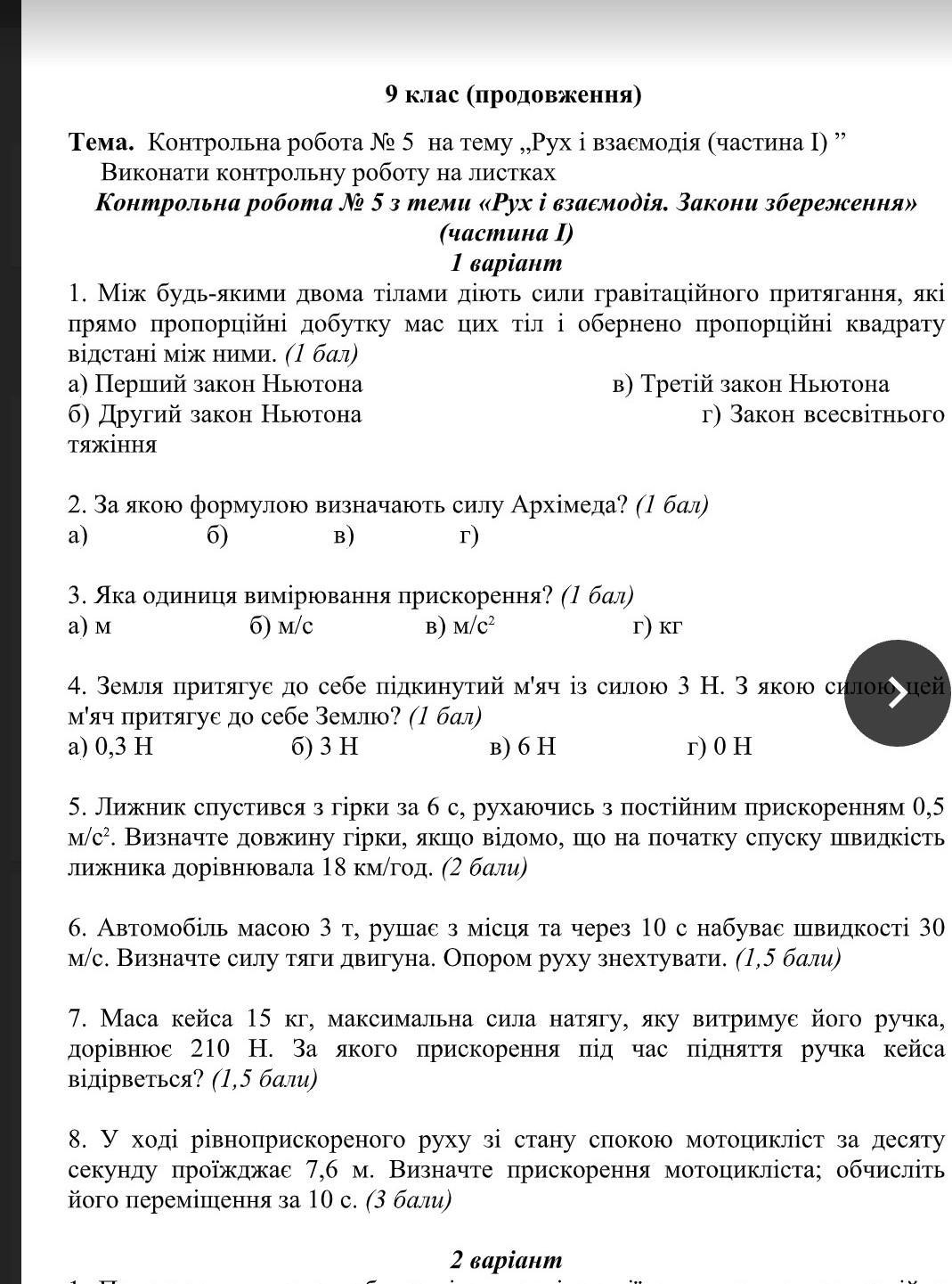 Рух і Взаємодія фізика 9 клас Контрольна робота ​