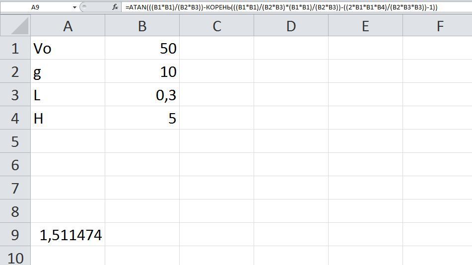 =ATAN(((B1*B1)/(B2*B3))-КОРЕНЬ(((B1*B1)/(B2*B3)*(B1*B1)/(B2*B3))-((2*B1*B1*B4)/(B2*B3*B3))-1))