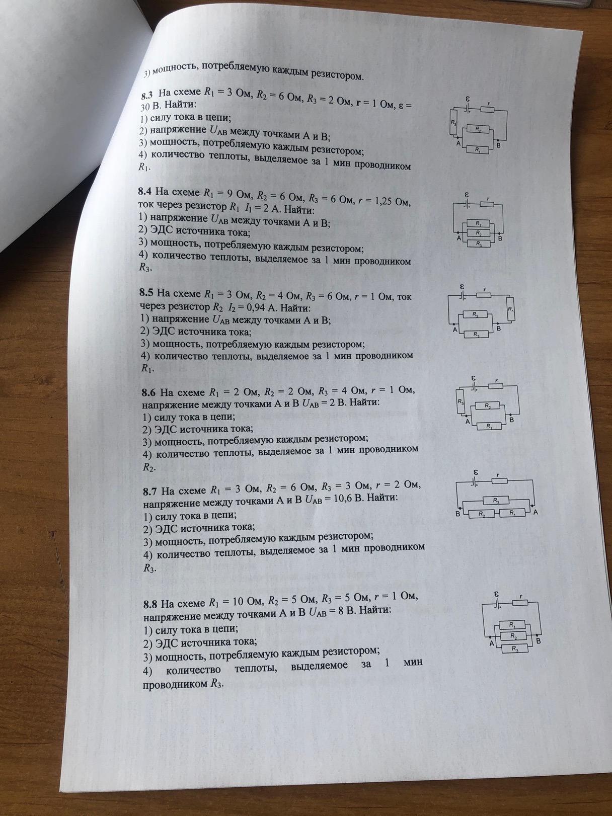 На схеме R1 = 3 Ом, R2 = 6 Ом, R3 = 2 Ом, r = 1 Ом, е = 30 В. Найти: 1) силу тока в цепи; 2) напряжение UАВ между точками А и В; 3) мощность, потребляемую каждым резистором; 4) количество теплоты, выделяемое за 1 мин проводником R1.