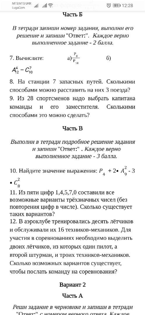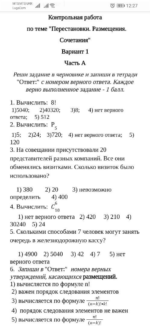 Контрольная работа по теме "Перестановки. Размещения. Сочетания" Вариант 1
