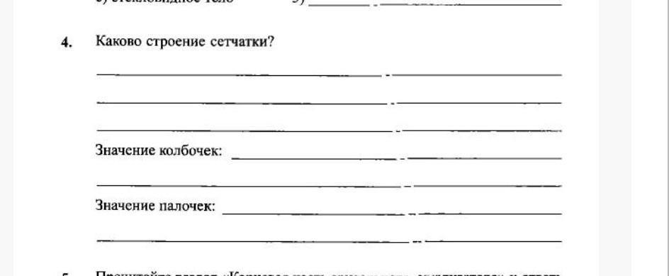 сетчатку находится за стекловидным телом, состоит ищ колбочек(в центре, отвечают за цветовое зрение, бывают 3 цветов красный, зеленый, стний) и палрчек(сумеречное зрение)