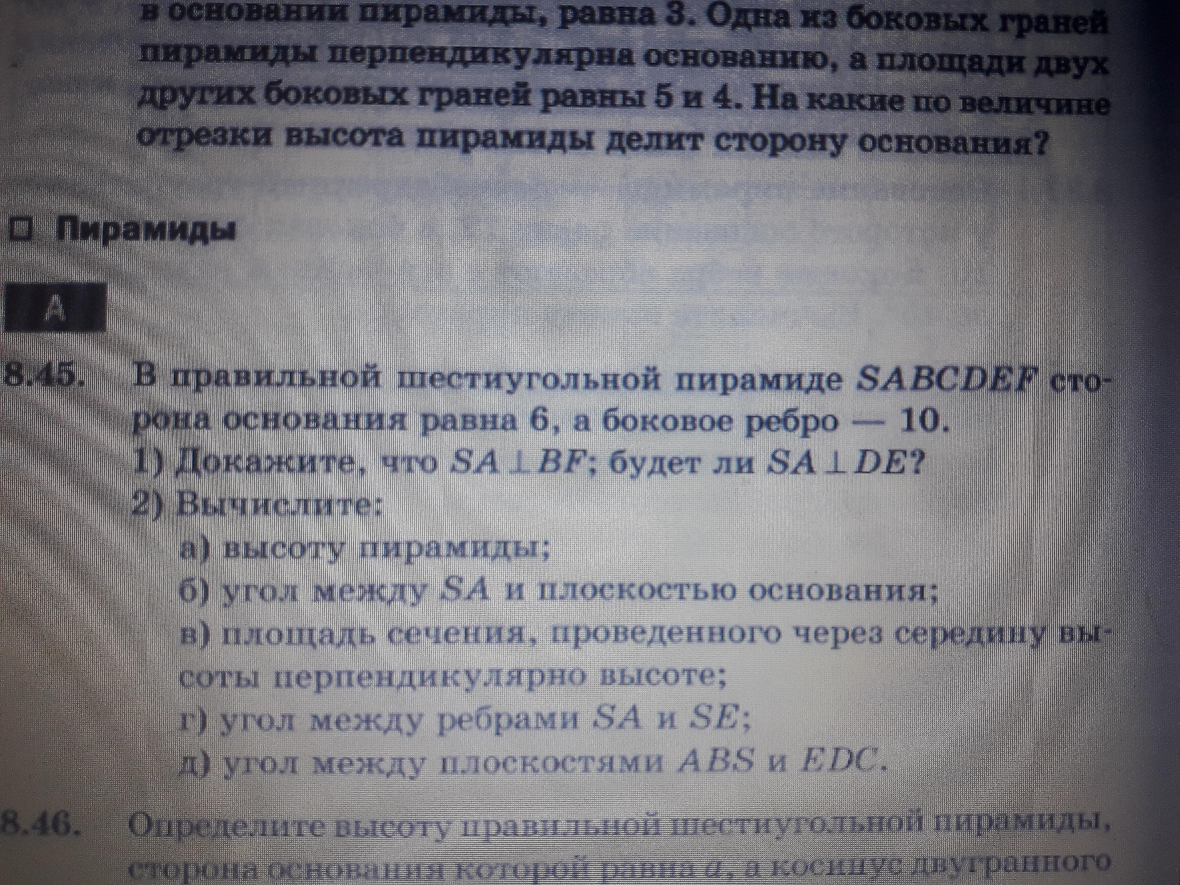 В правильной шестиугольной пирамиде SABCDEF сторона основания равна 6, а боковое ребро 10