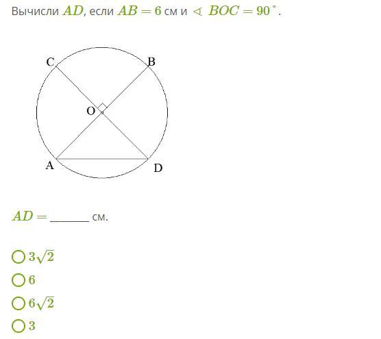 Вычисли AD , если AB = 6 см и ∢ BOC = 90 ° .