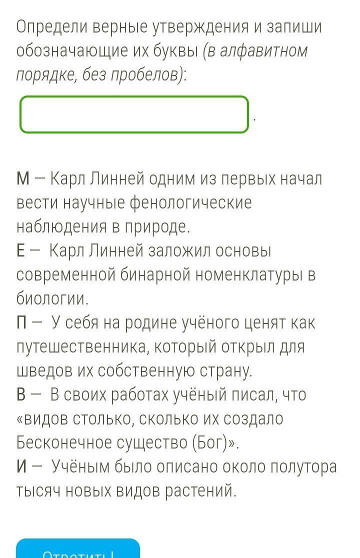 Правильные ответы - Е, В, И. На основании того, что Карл Линней - выдающийся ботаник, мы можем определить вариант ответа И как верный. На основании того, что Карл Линней - создатель системы классификации живого мира, мы можем определить вариант ответа Е как верный. И на основании того, что Карл Линней креационист (креационизм - теория зарождения жизни на Земле Творцом), мы определяем вариант ответа В как верный.