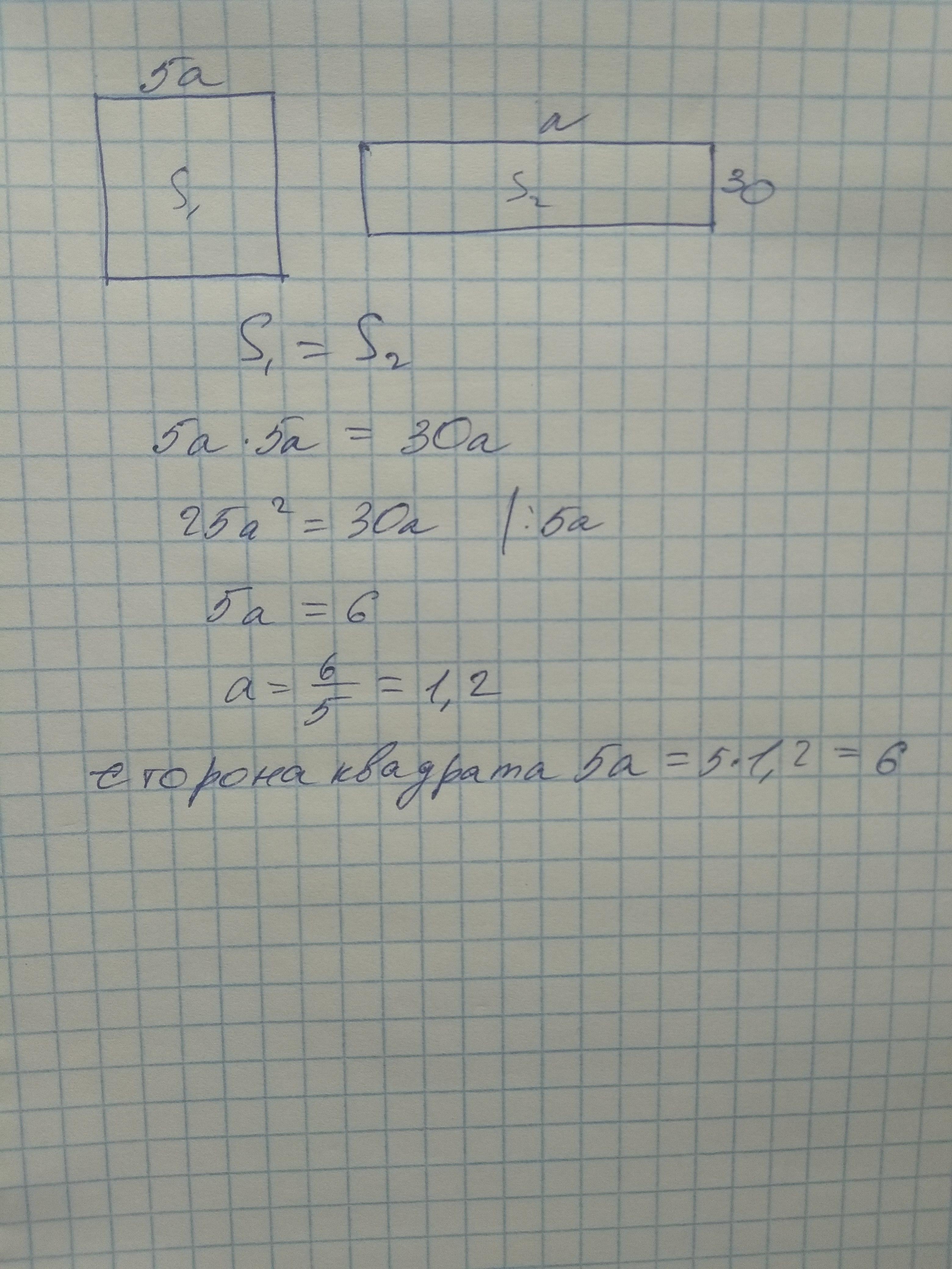 Площадь квадрата равна площади прямоугольника, одна сторона которого в 5 раз меньше стороны квадрата, а другая имеет длину 30 см. Найдите сторону квадрата.