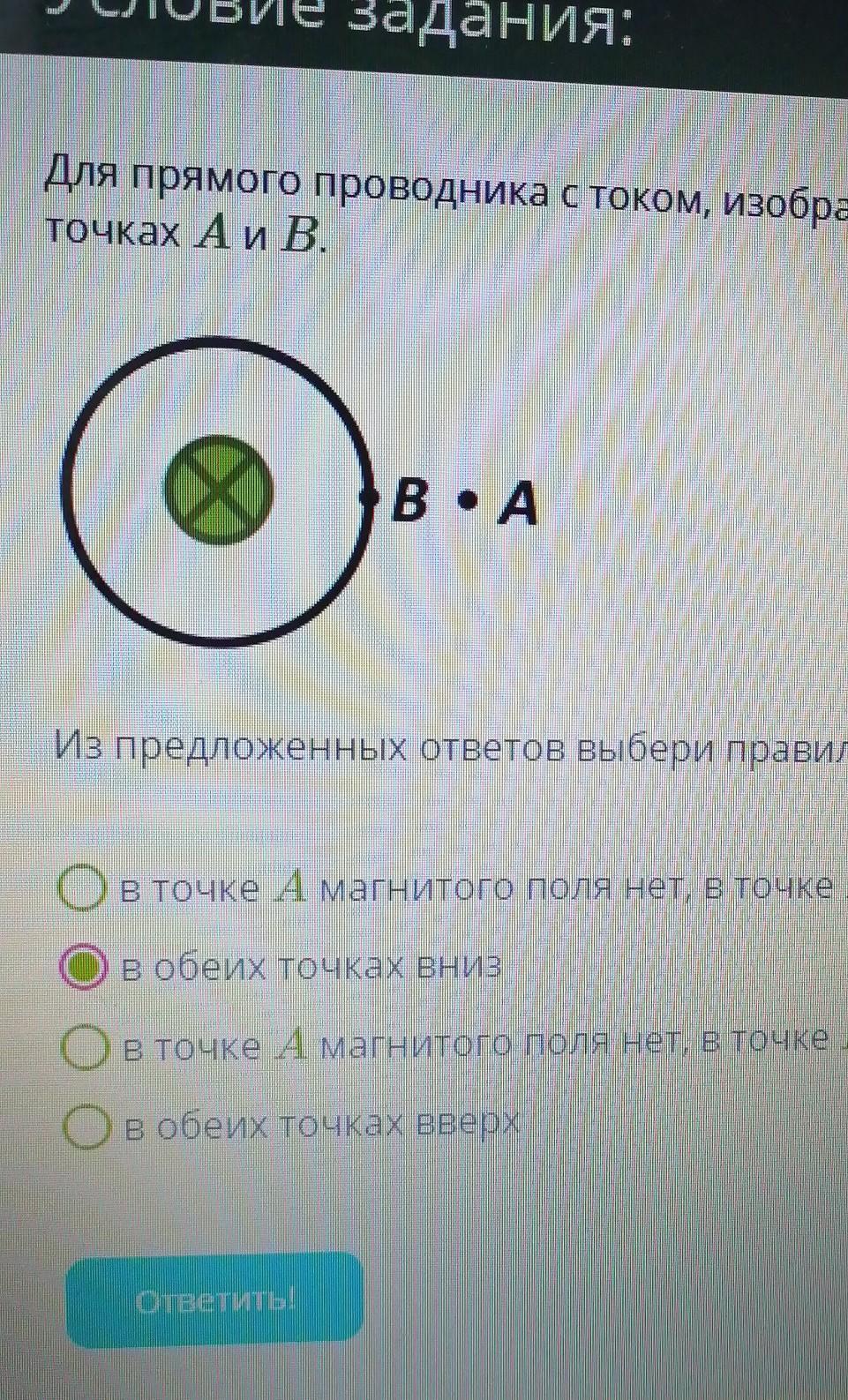 Для прямого проводника с током, изображённого на рисунке, определи направление линий магнитного поля