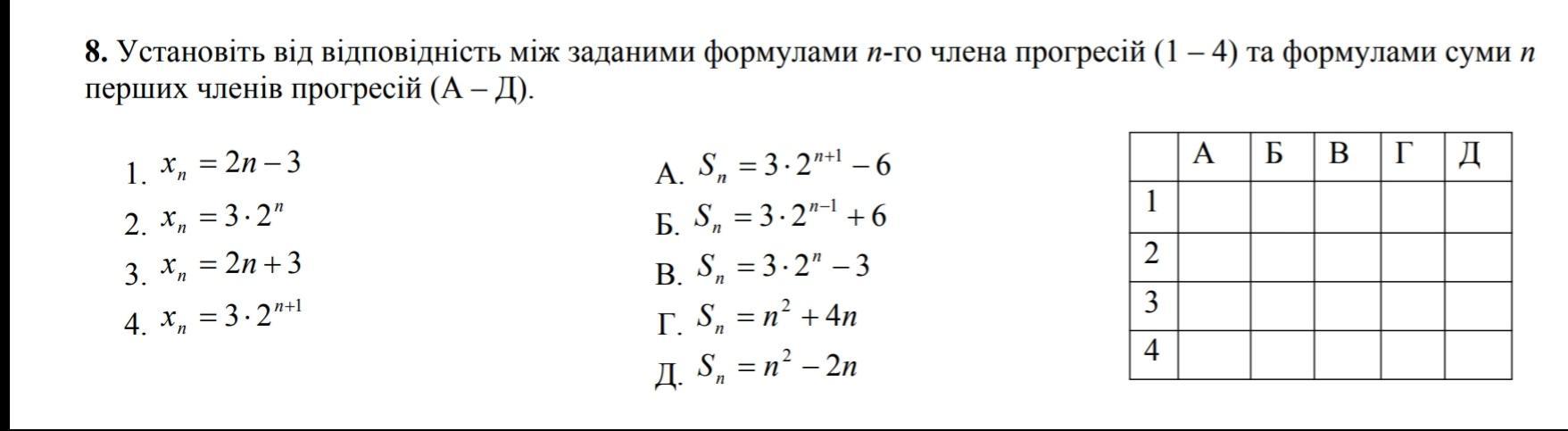 Установіть від відповідність між заданими формулами п-го члена прогресій (1 – 4) та формулами суми п