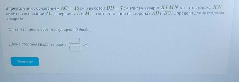 В треугольник с основанием AC = 18 см и высотой BD = 7 см вписан квадрат KLMN так, что сторона KN