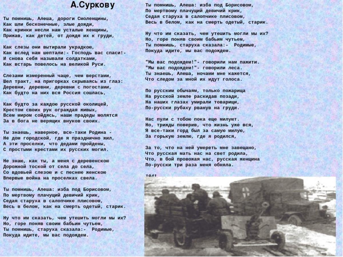 Осенью 1941 года поэт написал стихотворение «Ты помнишь, Алеша, дороги Смоленщины…», в котором словно бы ведет неспешную беседу со своим фронтовым товарищем.