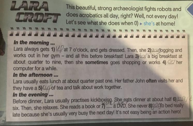 Ответ:Лара олвэйс гетс ап эт севен оклок,энд гетс дрэсэд. Зен щи говс фугинг энд воркс аут ин хё гам- энд ол зис бифо брэкфаст!Лара хас э биг брэкфаст эбаут квоте ту найн, зен щи самтаймс говс шопинг о воркс. Он хё компьютэ фо э вайал.