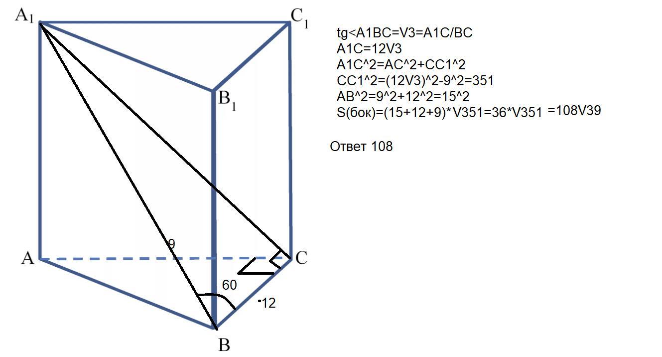 В основании прямой призмы ABCA1B1C1 лежит прямоугольный треугольник ABC с прямым углом C. Известно, что AC=9, BC=12, а ∠A1BC=60∘. Найдите площадь боковой поверхности призмы. В ответе укажите число, деленное на корень из 39.