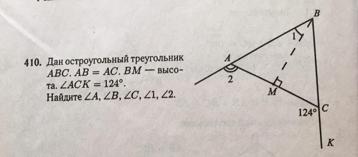 Дан остроуголный треугольник ABC. AB=AC. BM- высота. угол ACK = 124 градуса. Найдите угол A. D. C. 1. 2.