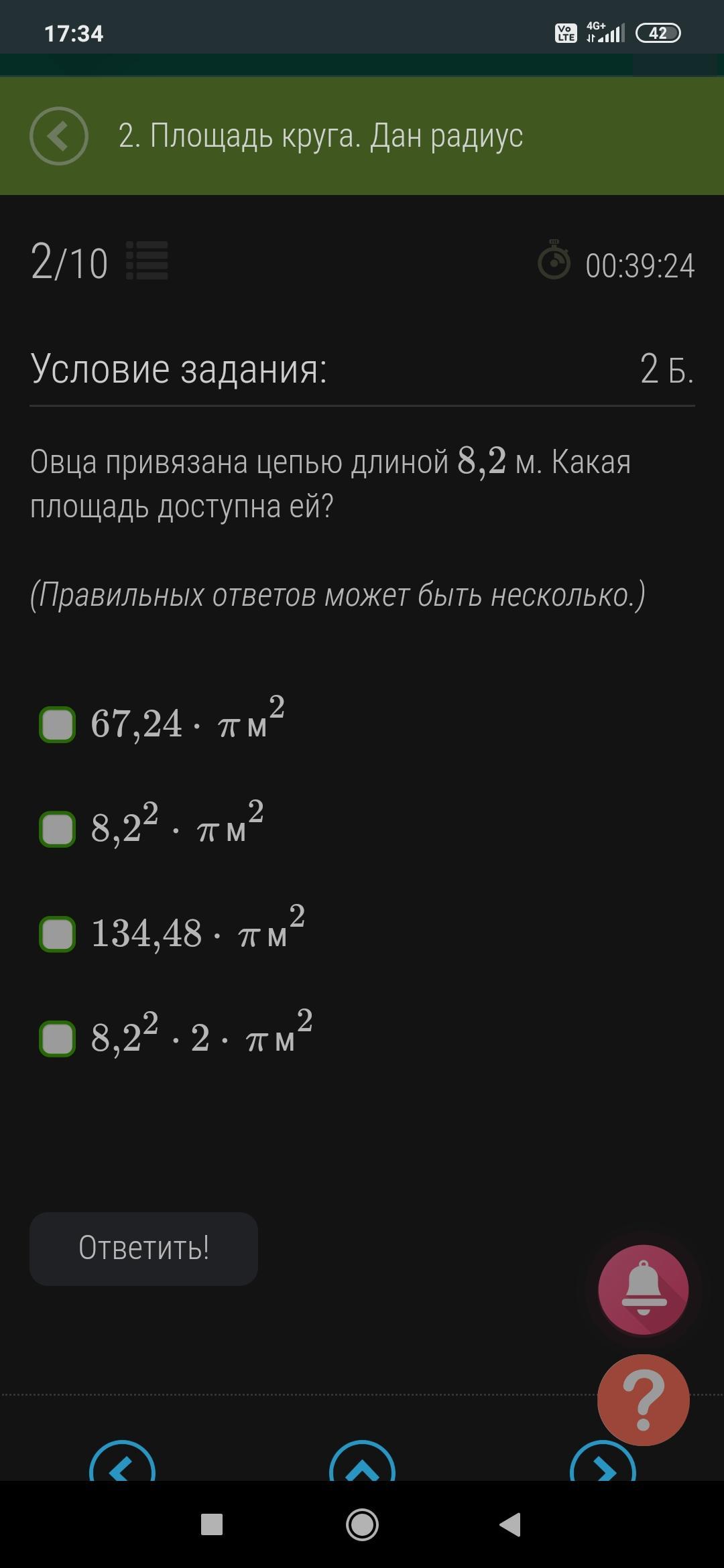 Овца привязана цепью длиной 8,2 м. Какая площадь доступна ей?